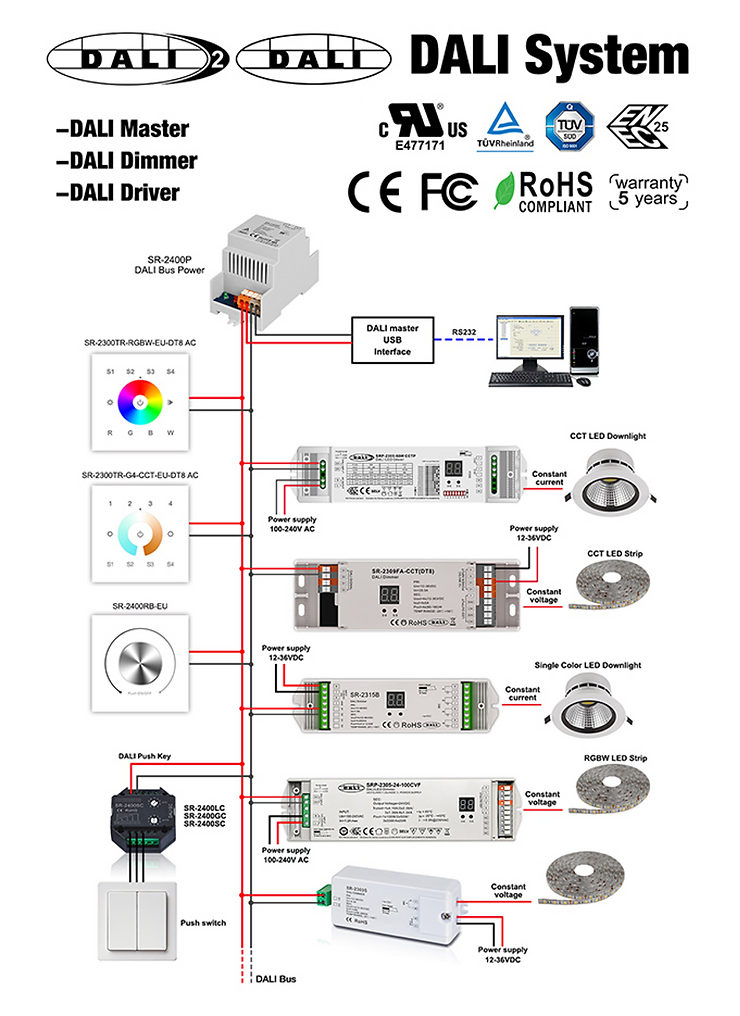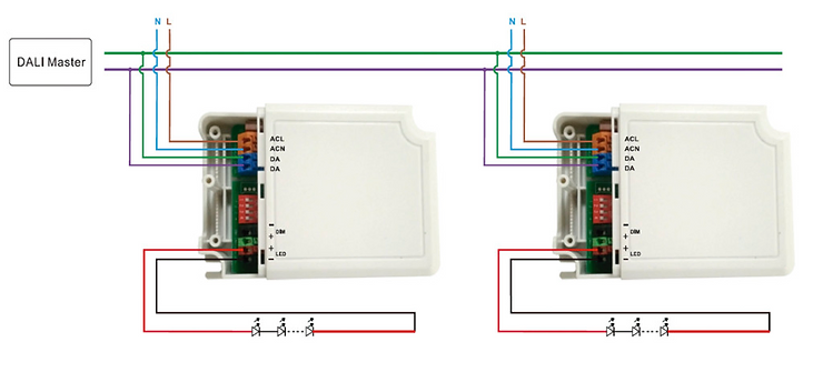 Precisa que o cabo de sinal de controle esteja alimentado desde um ponto (bus DALI).